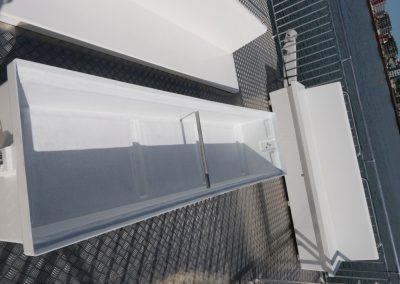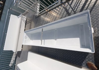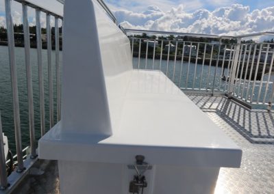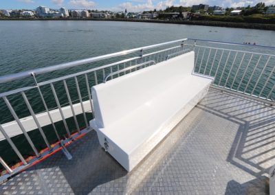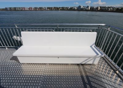 Bekkirnir eru út trefjaplasti og henta því sérstaklega vel út fyrir á farþegabátum. Erfi hlutann er hægt að losa með smellunm og opna þannig fyrir geymsluhólfið með því að taka efri hlutann ofan af.