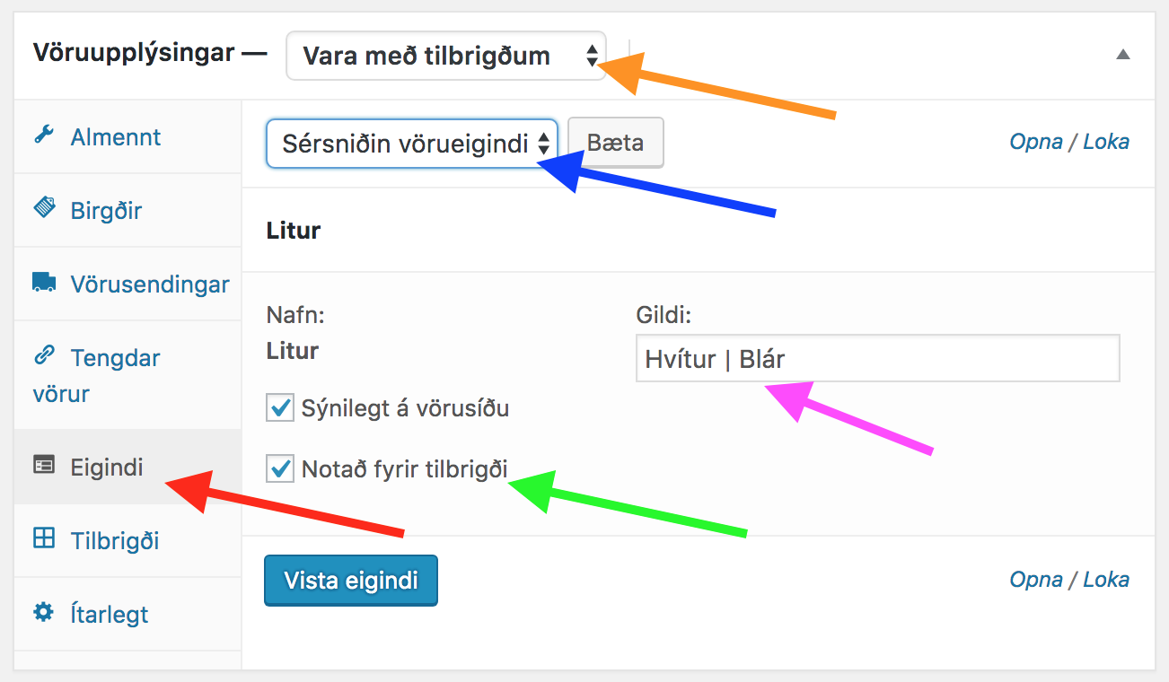 Vista og þá er þessi vara komin með möguleikann á að velja Hvítan eða Blár litur…en fyrst þarf að stilla verð fyrir vöru með tilbrigðum, sjá fyrir neðan.