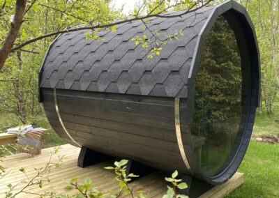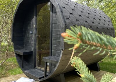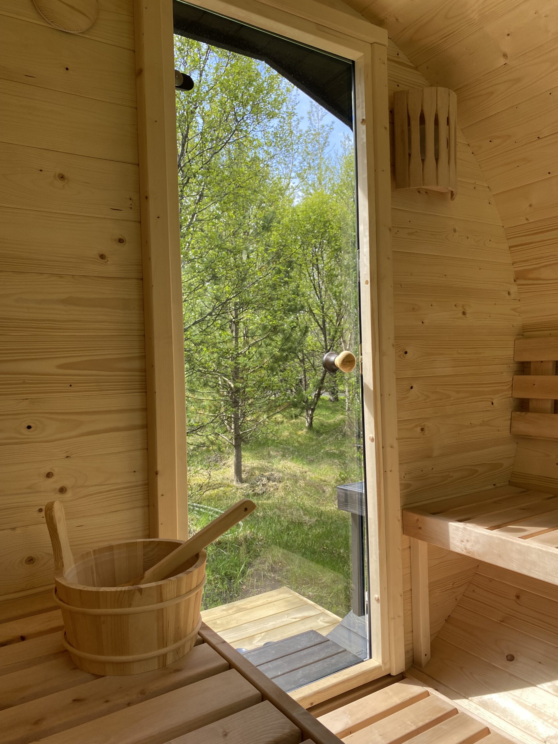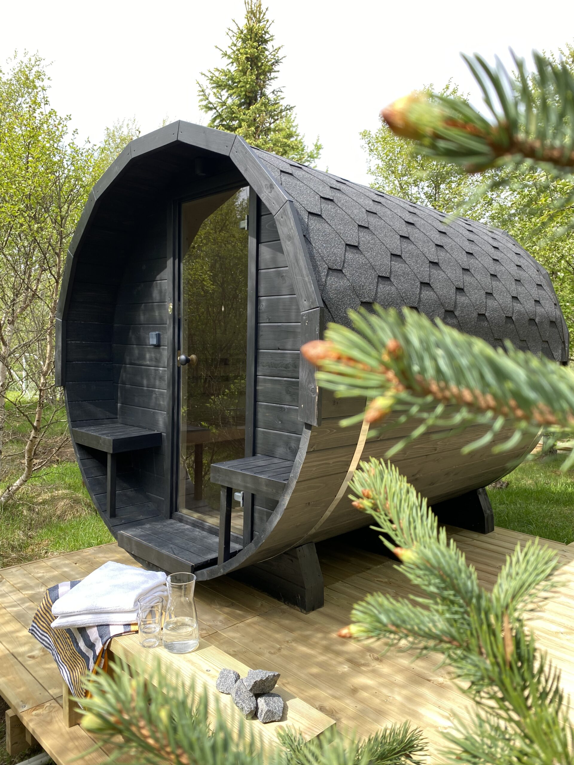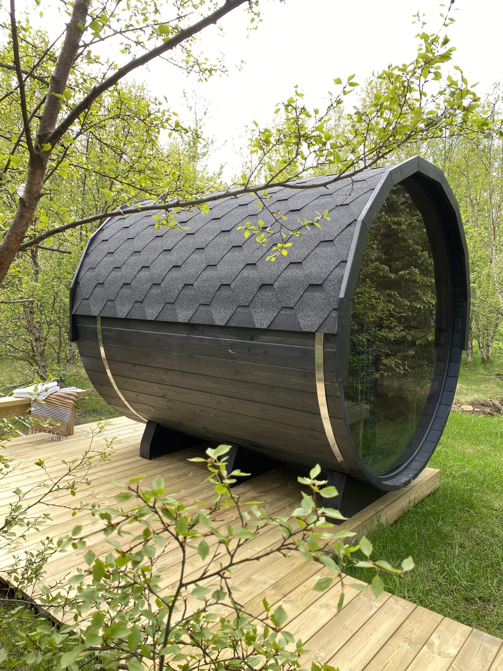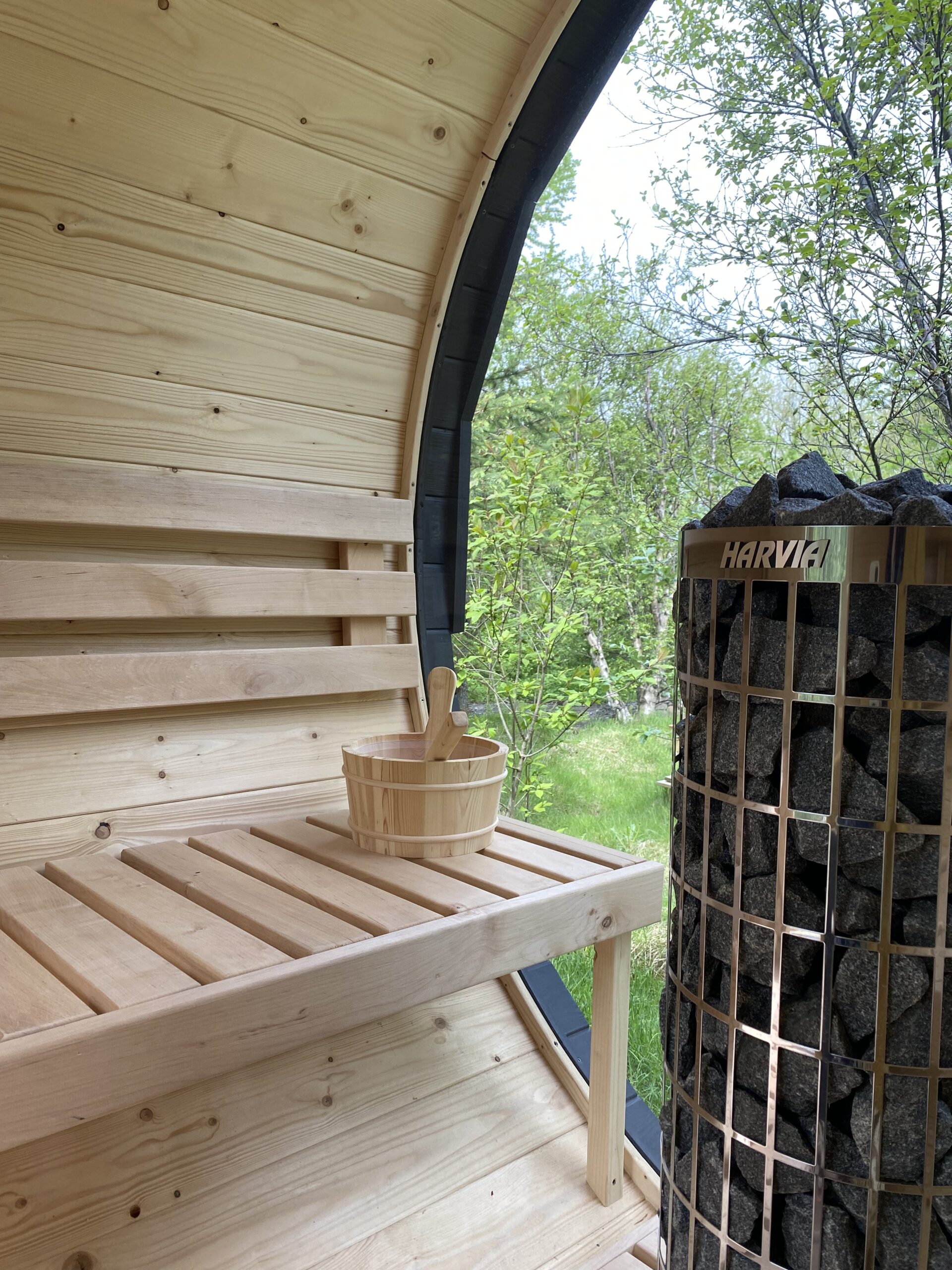 Falleg og rúmgóð saunutunna sem auðvelt er að koma fyrir hvar sem er.