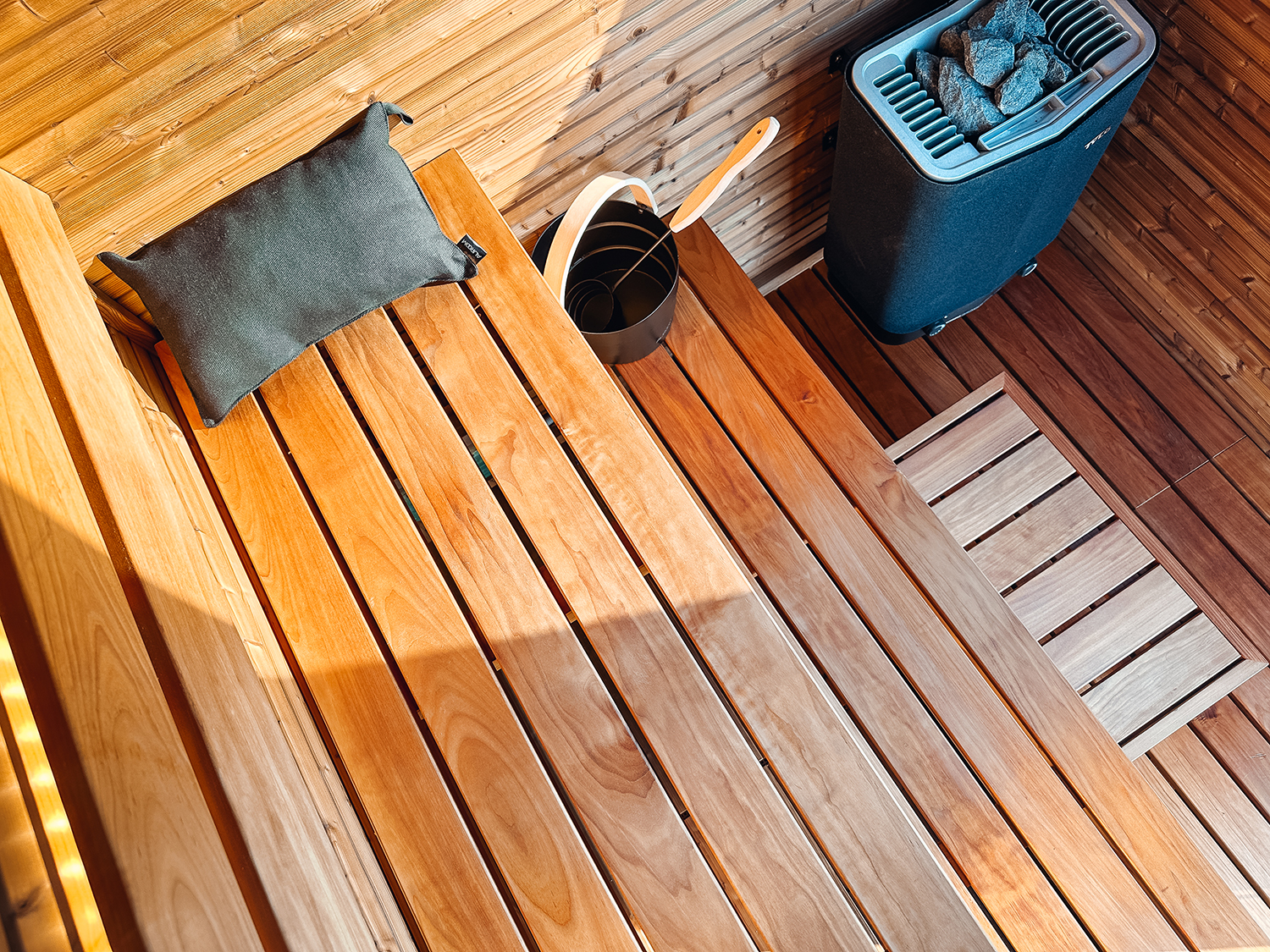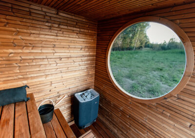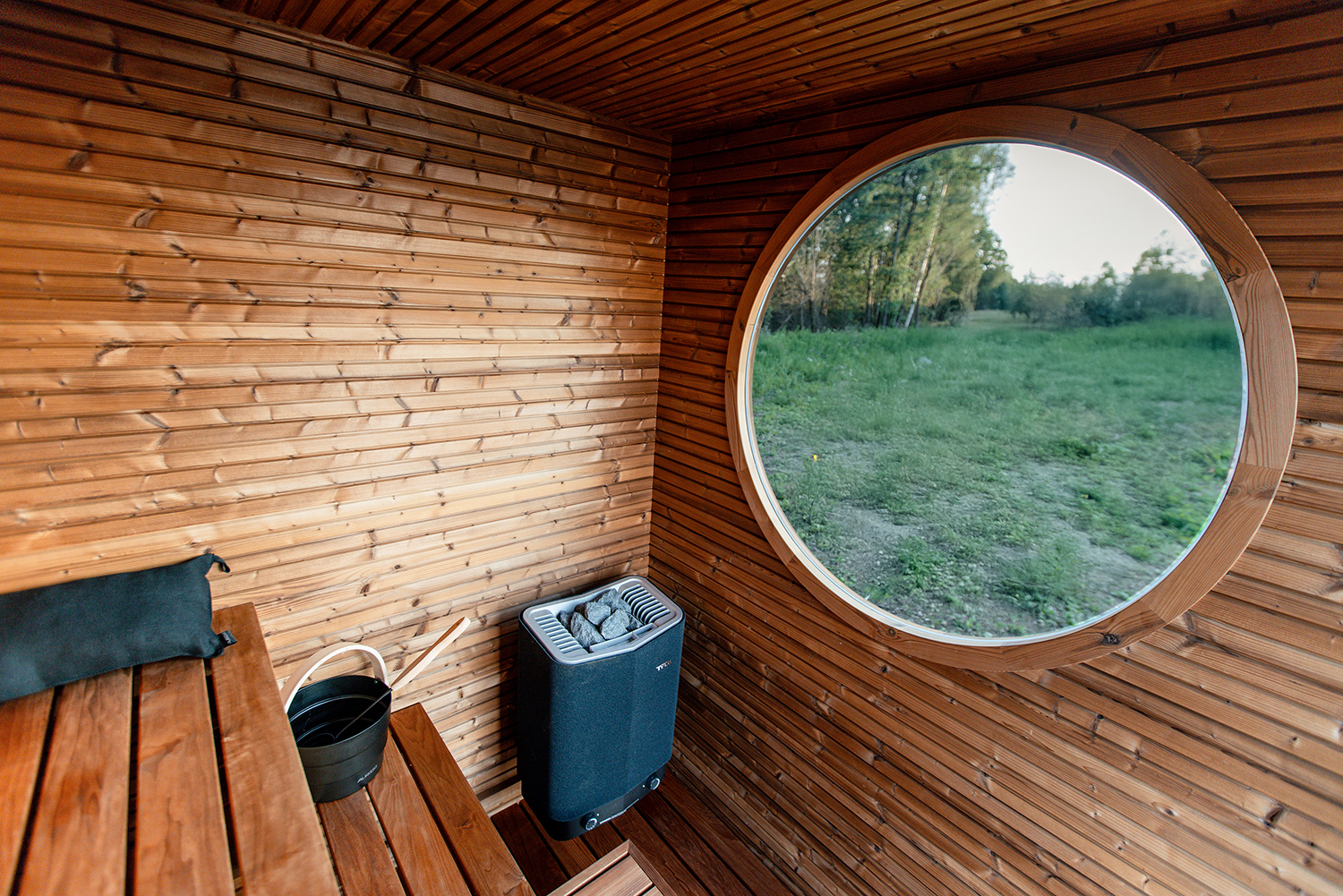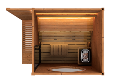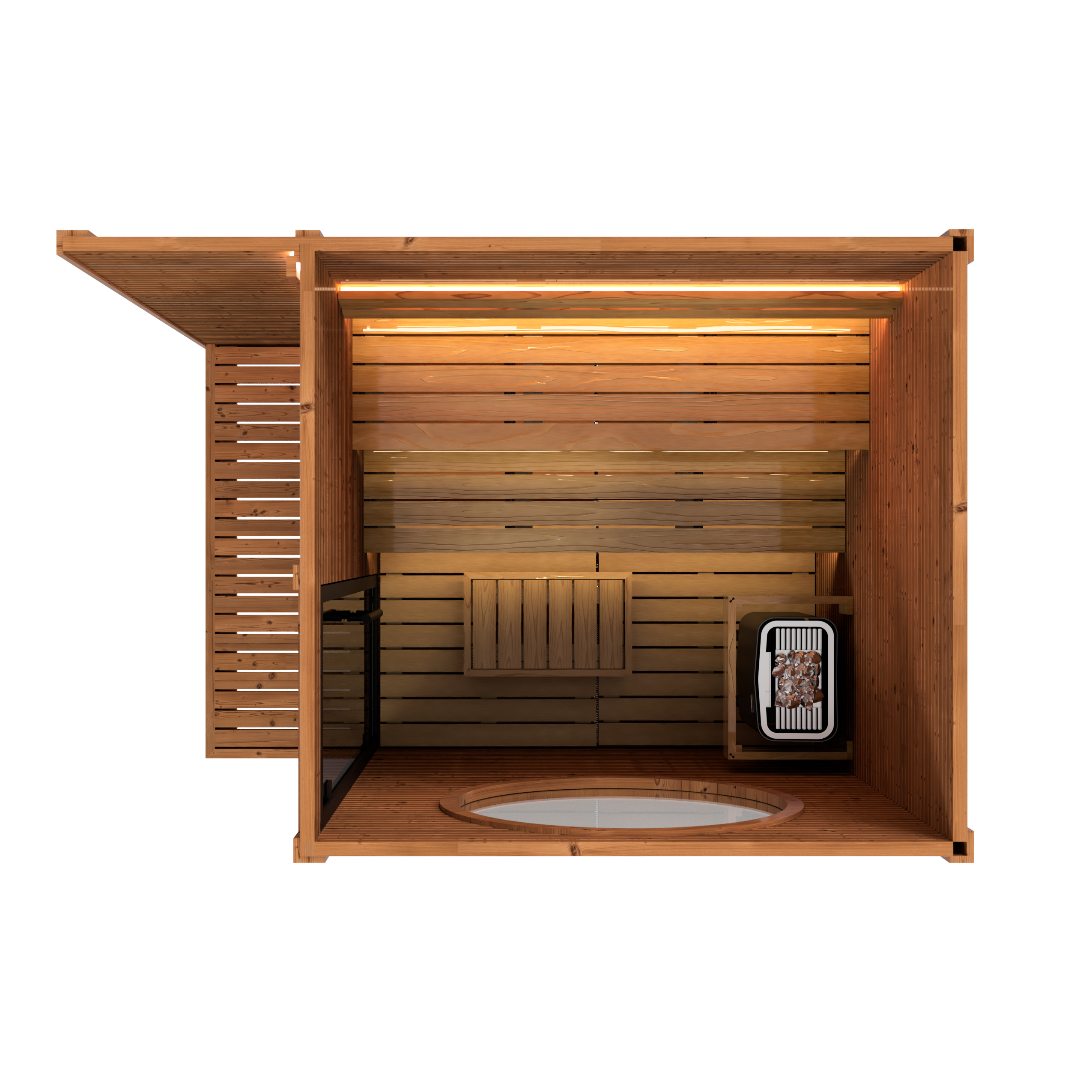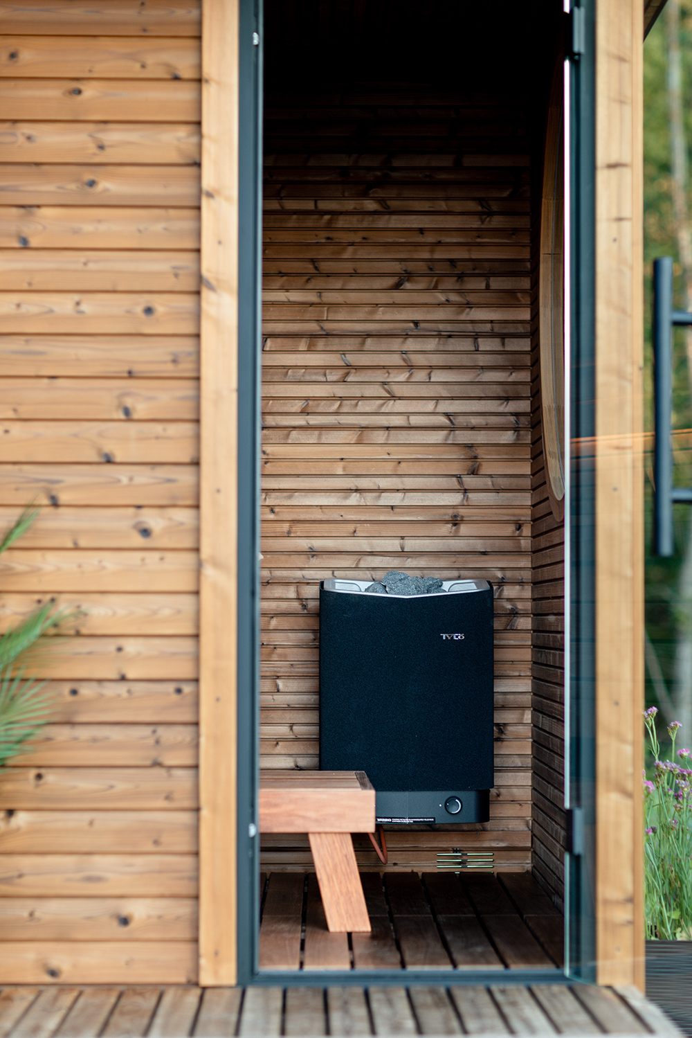 BenchesThermo aspen Ambient LED lighting Integrated lighting enhances the sauna’s warm, inviting interior. Exclusive round window Modern lines, a small footprint, and a distinctive cladding profile make Kaia ideal for gardens, backyards, or holiday homes.