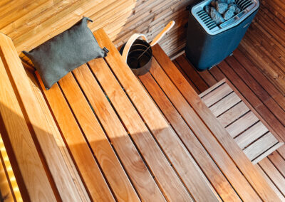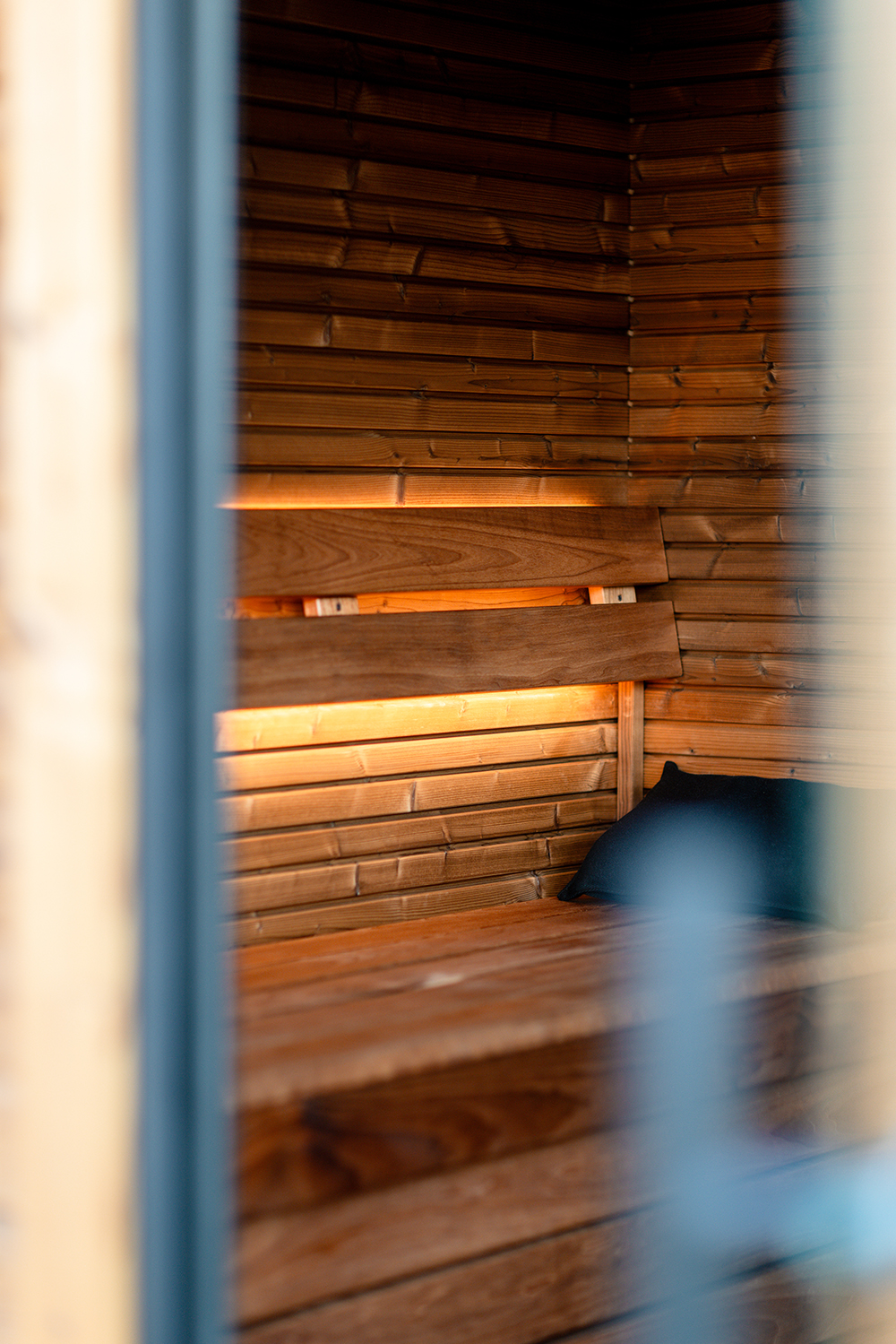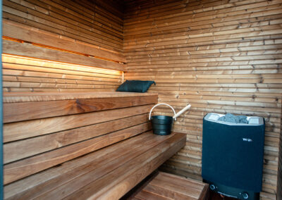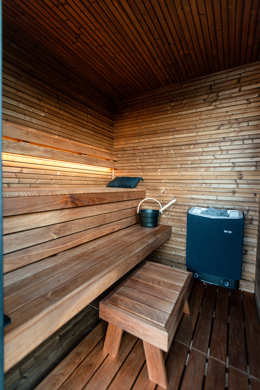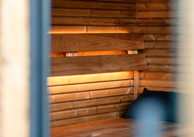 Integrated lighting enhances the sauna’s warm, inviting interior.