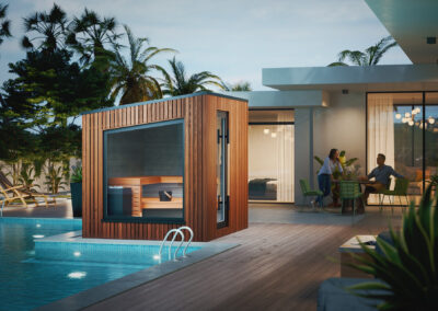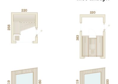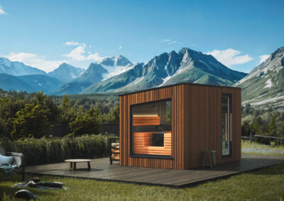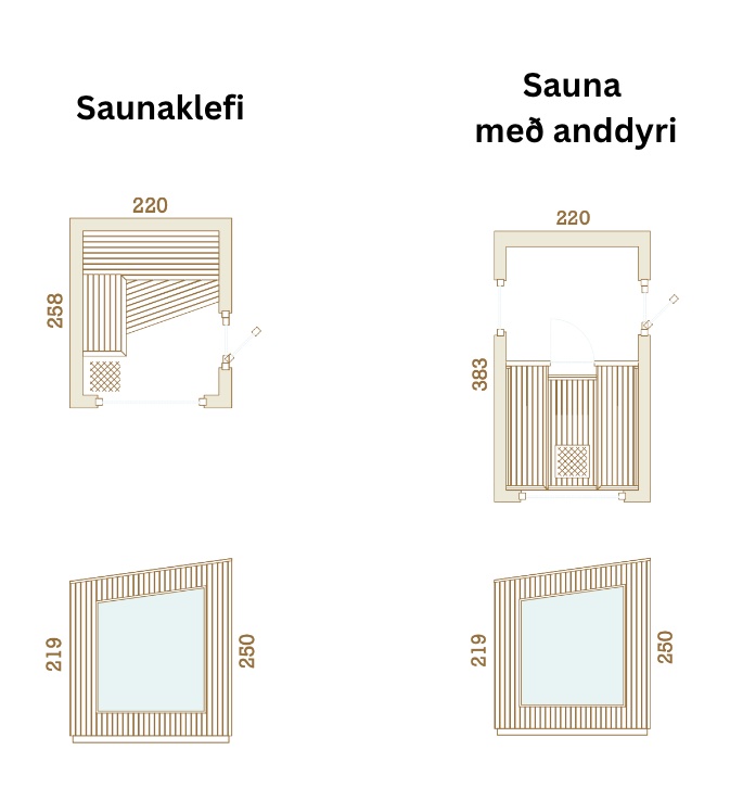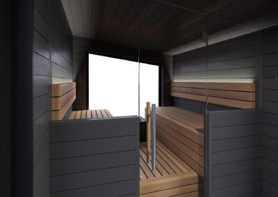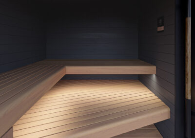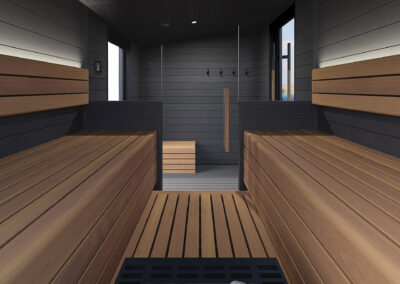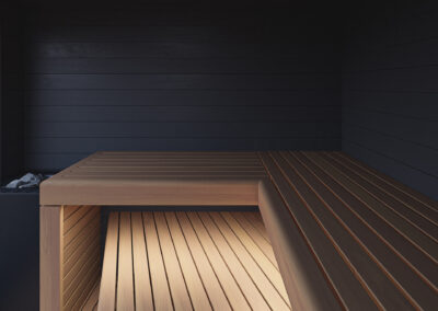 Mikið lagt upp úr að sánuklefinn sé viðhaldsléttur svo notaður er sérstaklega hitameðhöndlaður viður og klefinn allur byggður úr gegnheilu krosslímdu timbri.