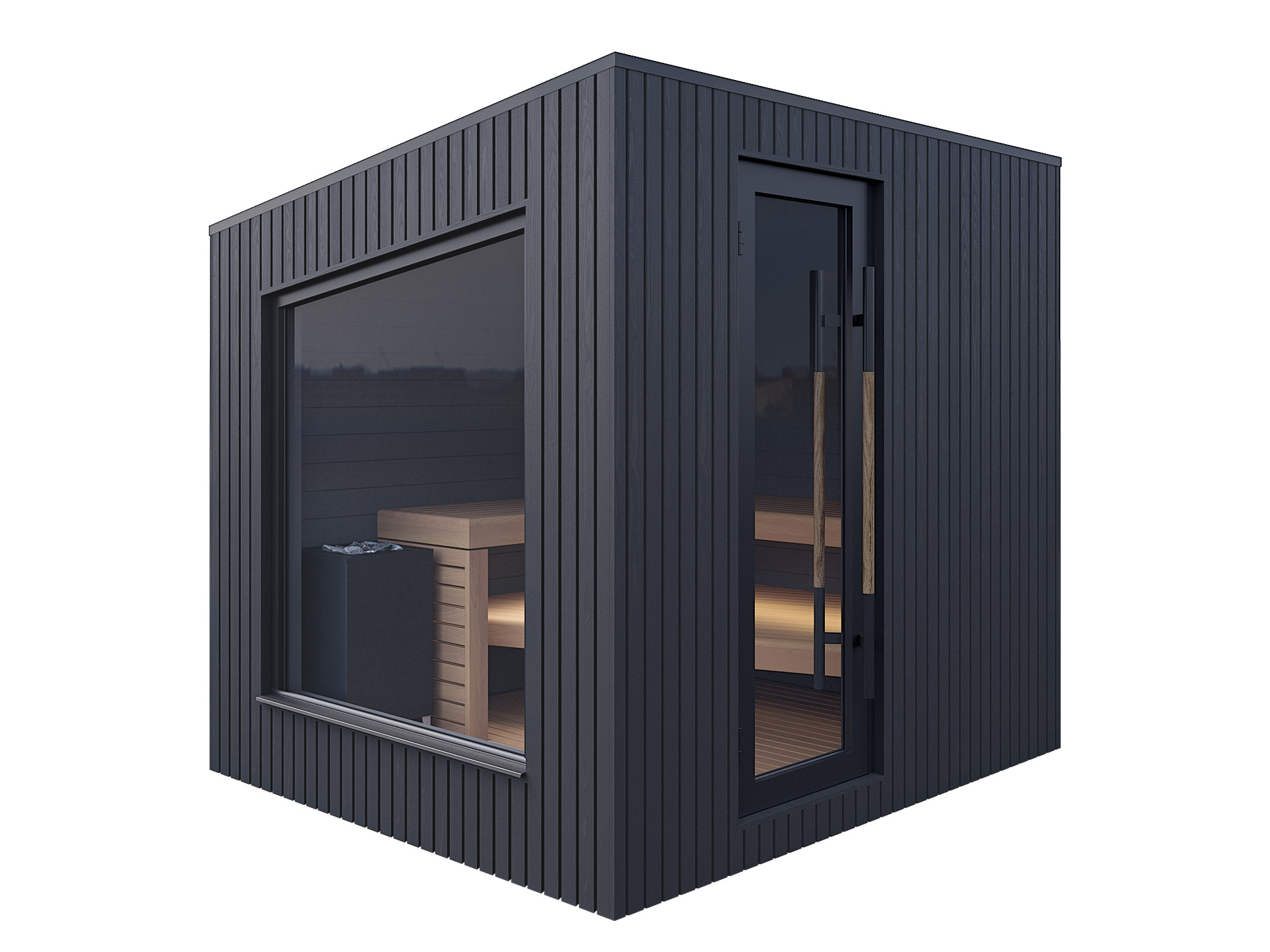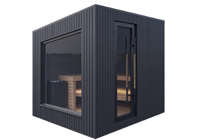 Terra sauna kemur samsett og tilbúin til notkunar með 10,5 kW hitara.