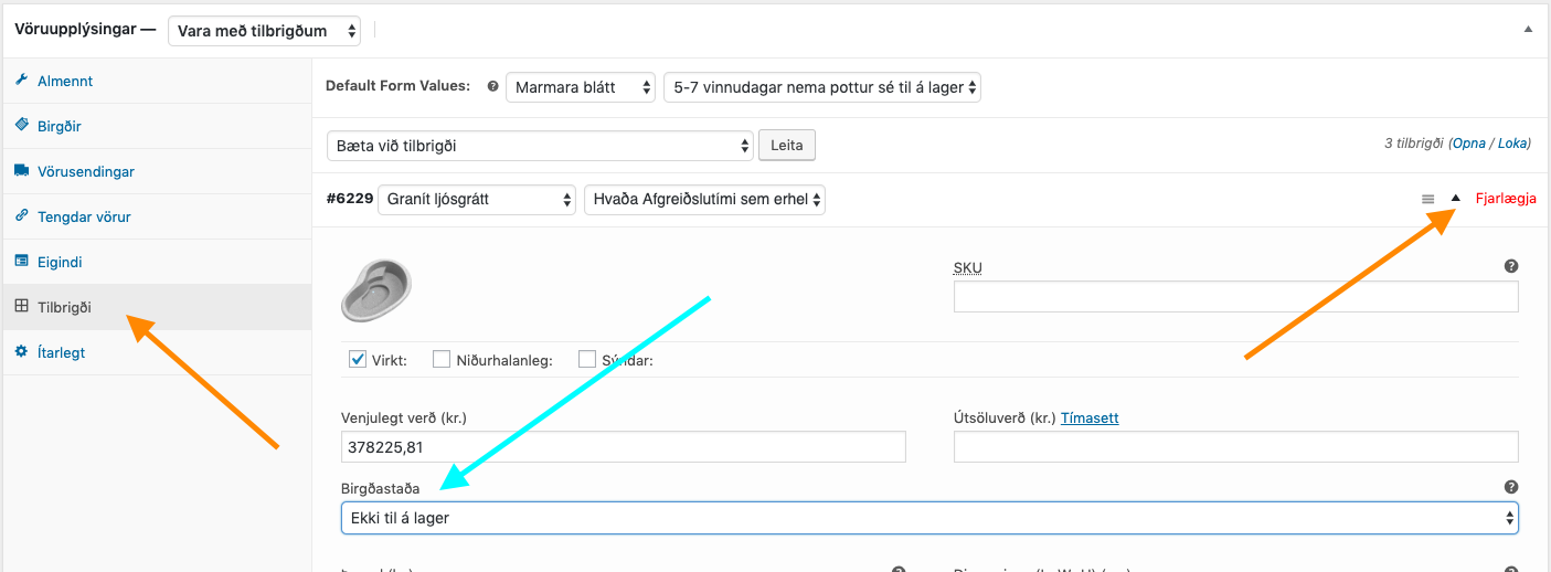 Appelsínugulu övarnar til að opna Tilbrigði og tiltekið tilbrigði (hægra megin) og síðan stilla Birgðastöðuna (ljósbláa örin) og vista