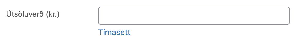 Til að setja afslátt (lægra verð) á vörur er sett inn Útsöluverð (í Woocommerce) og einnig hægt að tímastilla það með að smella á Tímasett og hægt er að sjá allar vörur sem eru á útsölu (á lægra verði) á /utsala (ath. að vörur með tímastilltan afslátt sjást bara þegar að afslátturinn er í gildi).