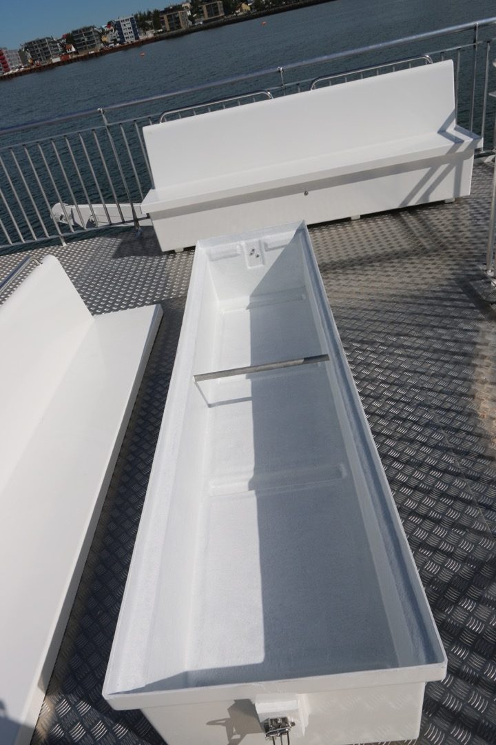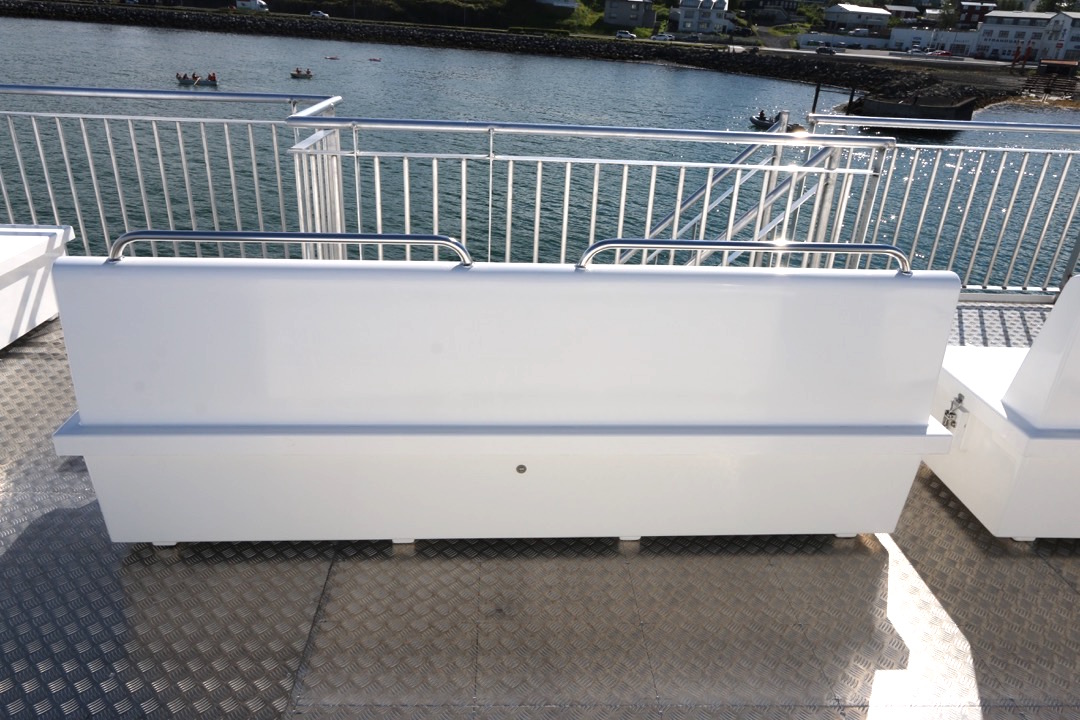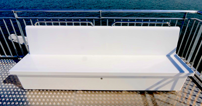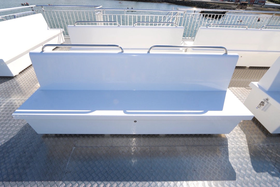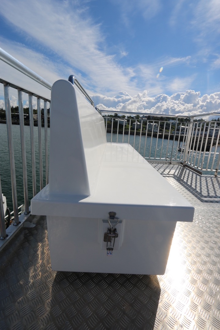 Bekkirnir eru út trefjaplasti og henta því sérstaklega vel út fyrir á farþegabátum. Erfi hlutann er hægt að losa með smellunm og opna þannig fyrir geymsluhólfið með því að taka efri hlutann ofan af.