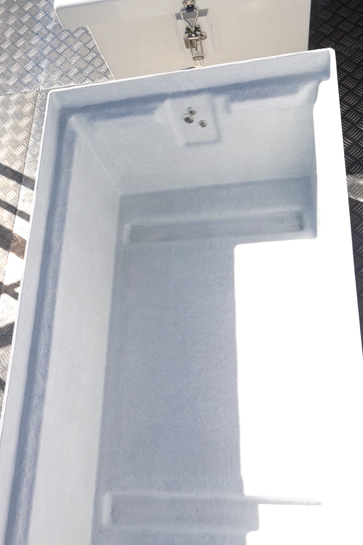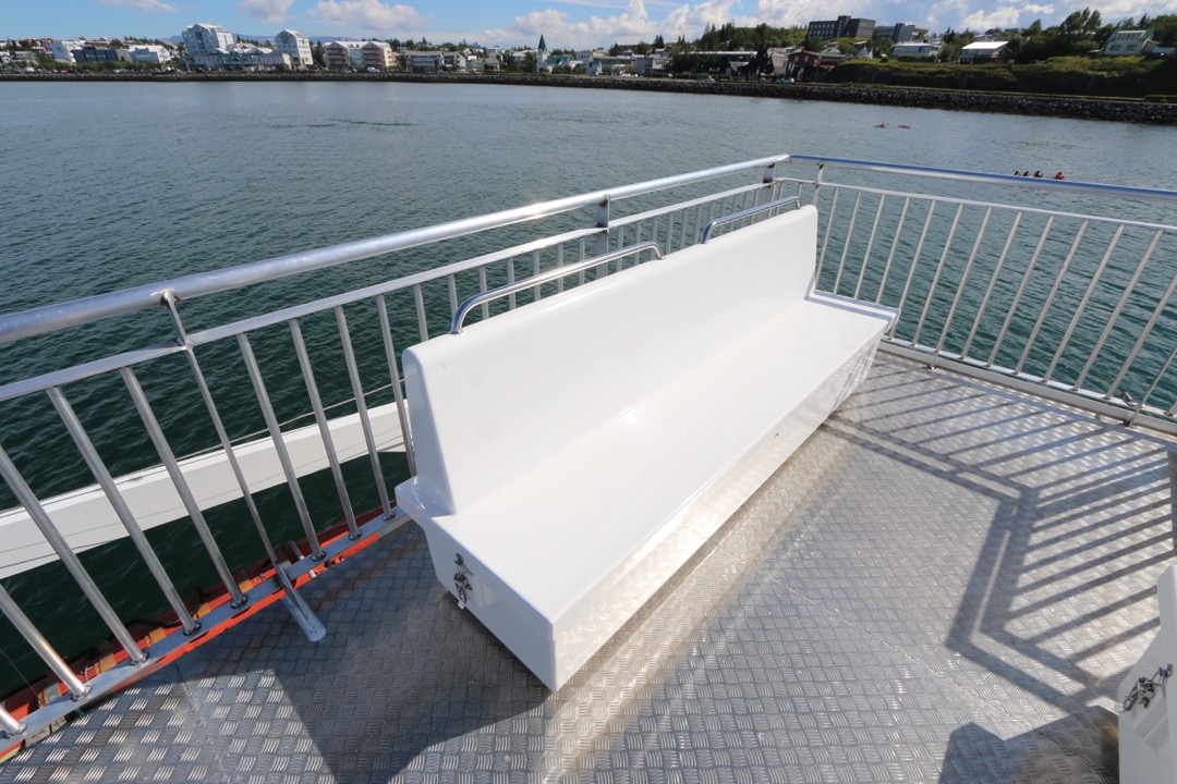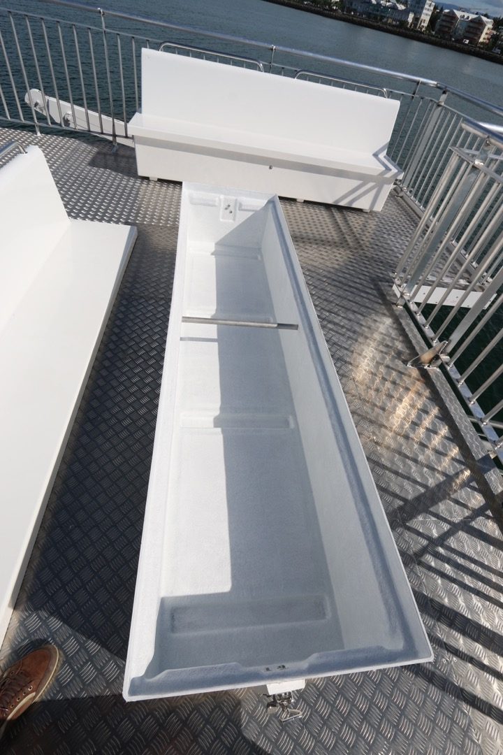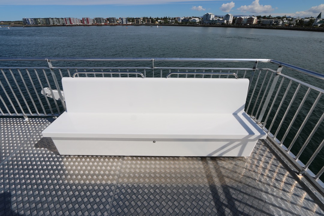 Bekkirnir eru út trefjaplasti og henta því sérstaklega vel út fyrir á farþegabátum. Erfi hlutann er hægt að losa með smellunm og opna þannig fyrir geymsluhólfið með því að taka efri hlutann ofan af.