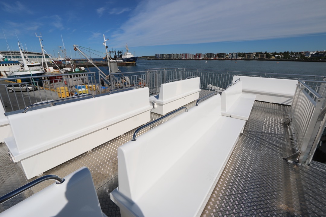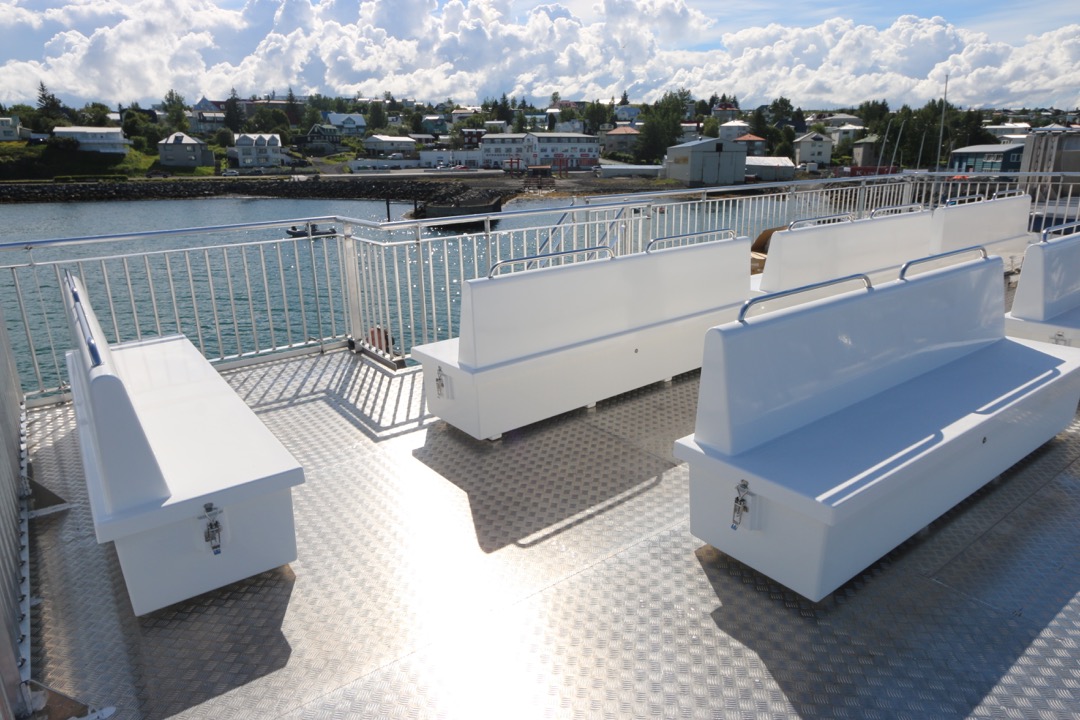 Harðgerðir útibekkir fyrir farþega með geymslu fyrir björgunarvesti.