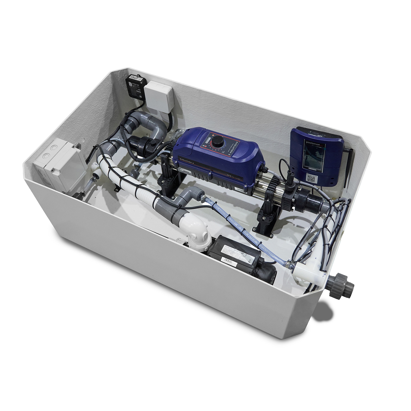 Nú er hægt að breyta hvaða skel sem er í rafhitaðan pott! Við höfum útbúið kassa úr trefjaplasti sem hýsir allan þann búnað sem þarf til að hita vatnið í pottinum og til að halda því tandurhreinu. Kassanum er auðvelt að koma fyrir, svo sem í þrepi við pottinn.